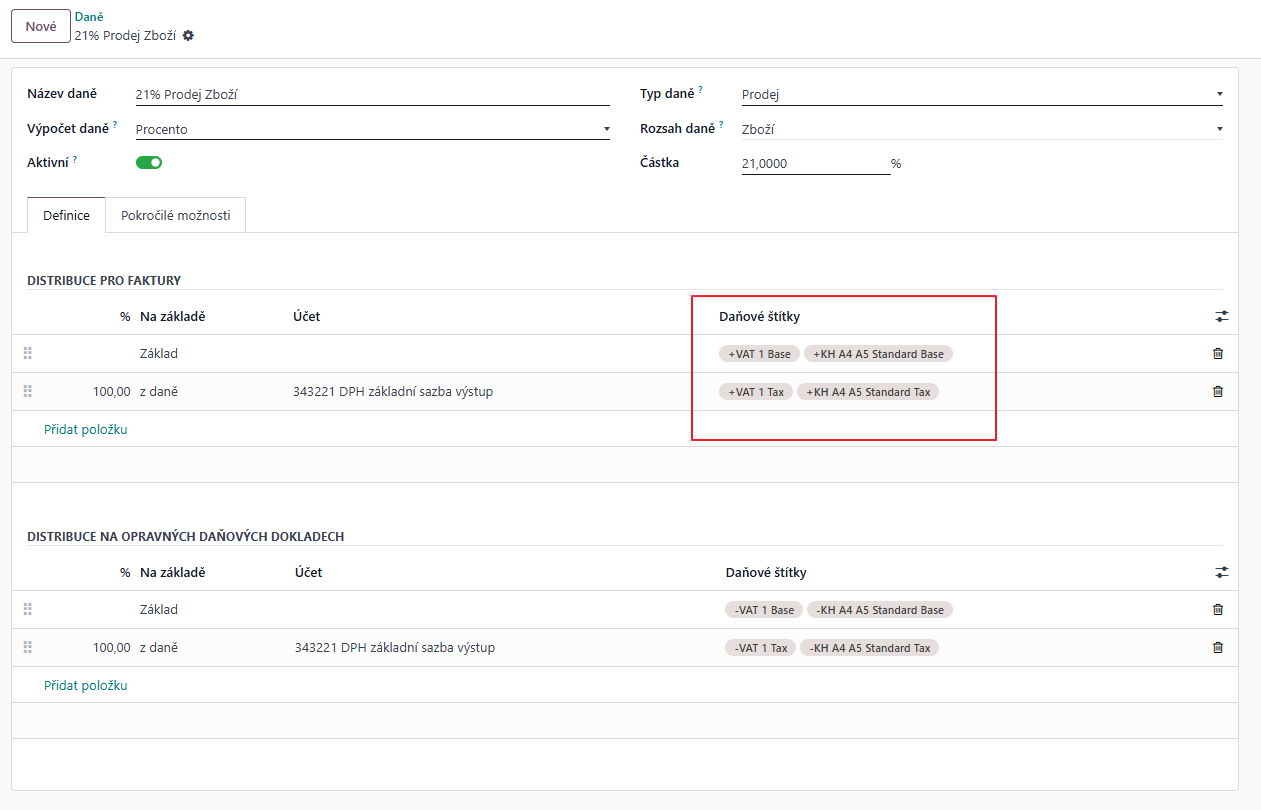Všechny daně v našem modulu již mají přednastavené štítky tak, aby se propisovaly na správné řádky dle platných předpisů. Pokud si ale budete daně upravovat, je důležité pochopit, jakým principem se štítky vyplňují.