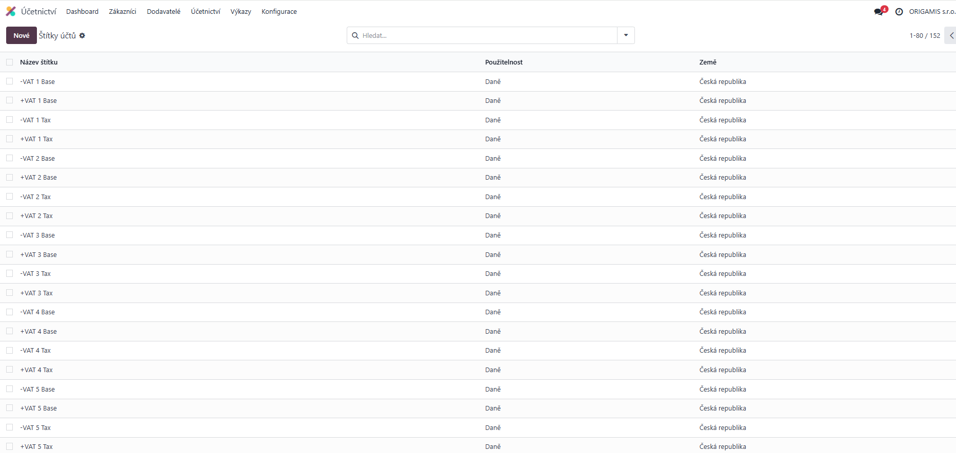 - Název - VAT / KH. VAT se používá pro hodnoty vstupující do přiznání k DPH, KH se používá pro hodnoty vstupující do Kontrolního hlášení. Pro Souhrnné hlášení daňové štítky neexistují, protože nejsou zapotřebí - logika generování hodnot pro SH je postavená na základě země a přítomnosti DIČ vašich zákazníků.