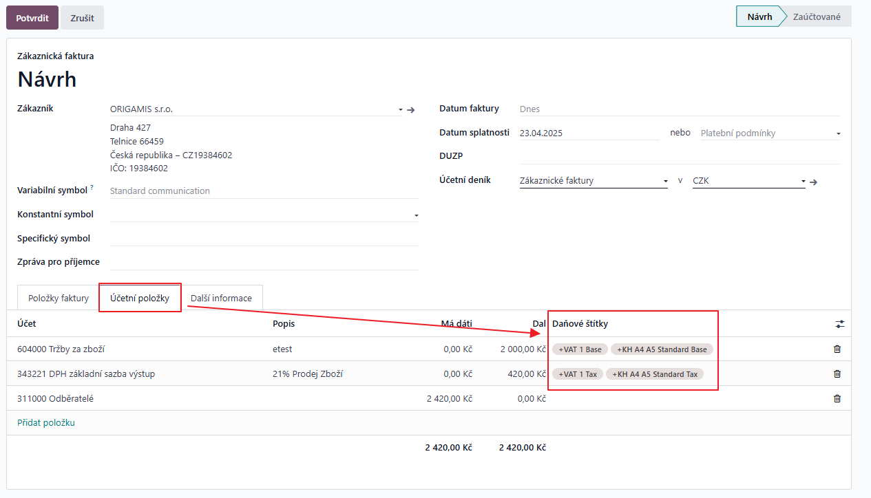 Na dani musí být přiřazen správný štítek, jinak se hodnota z faktury nepřipočítá do výkazu. Při návrhu faktury se dá ověřit, zda je vše správně nastaveno: