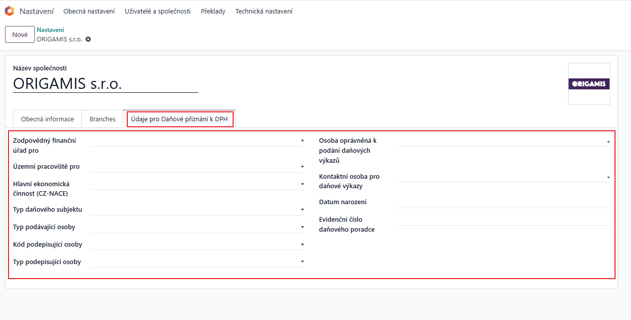 Pro správné generování .xml souborů je potřeba doplnit právně potřebné informace. Je tedy nutné vyplnit nová pole na detailu společnosti, které jsou pro kontext daného ekonomického subjektu relevantní. Při nevyplnění základních polí nelze zaručit správné vygenerování XML souboru k podání daného přiznání.
