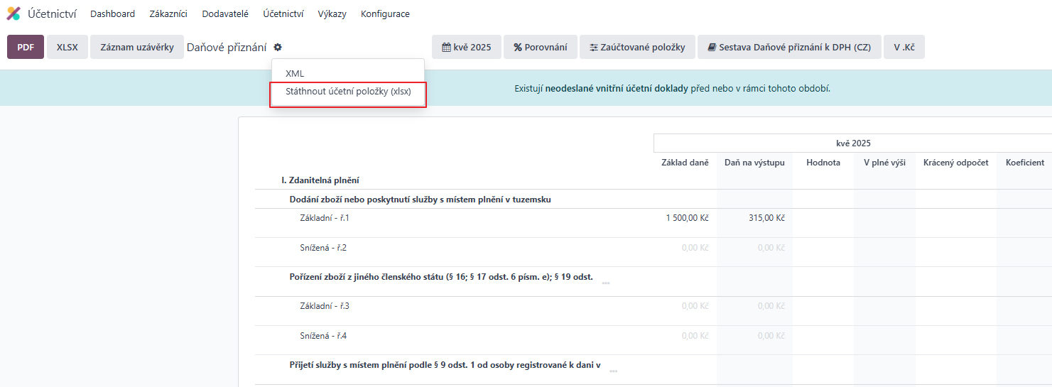 Alternativně si můžeme pro kontrolu stáhnout všechny položky vstupující do daného přiznání pomocí možnosti Stáhnout účetní položky (xlsl):
