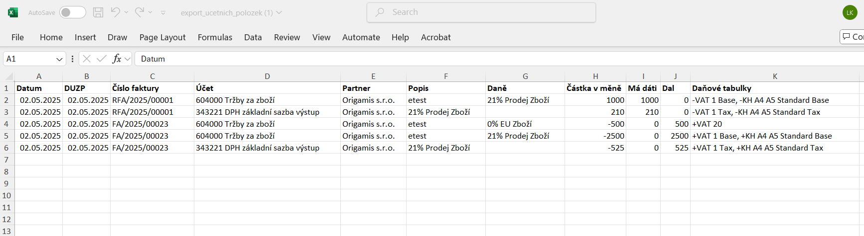 Nyní máme vyfiltrovány všechny položky, které by měly vstupovat do souhrnného hlášení. Stačí ověřit, zda sedí jednotlivé položky nebo samotné částky za jednotlivé záznamy.