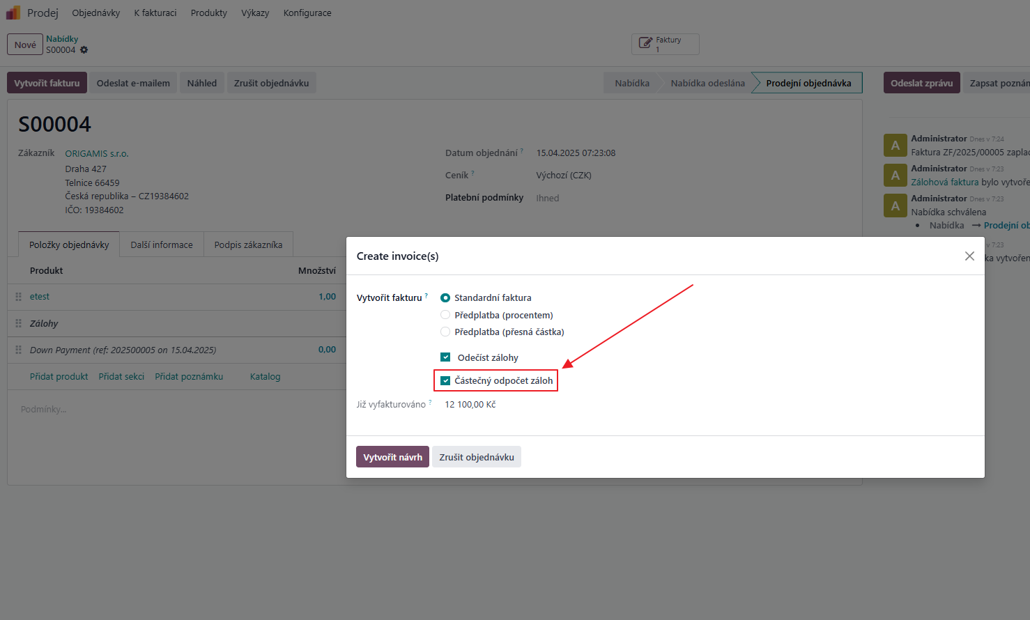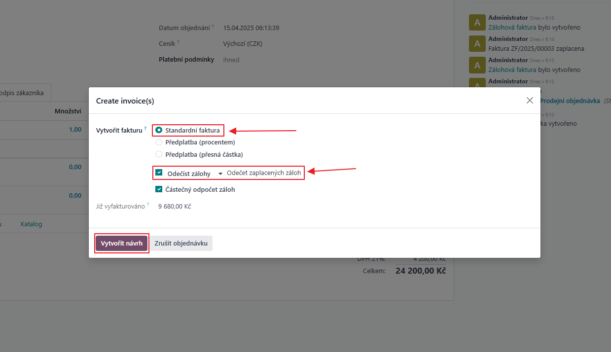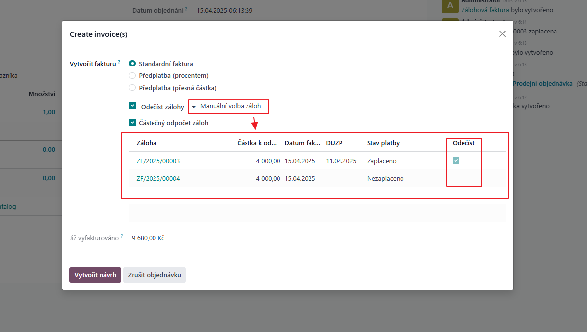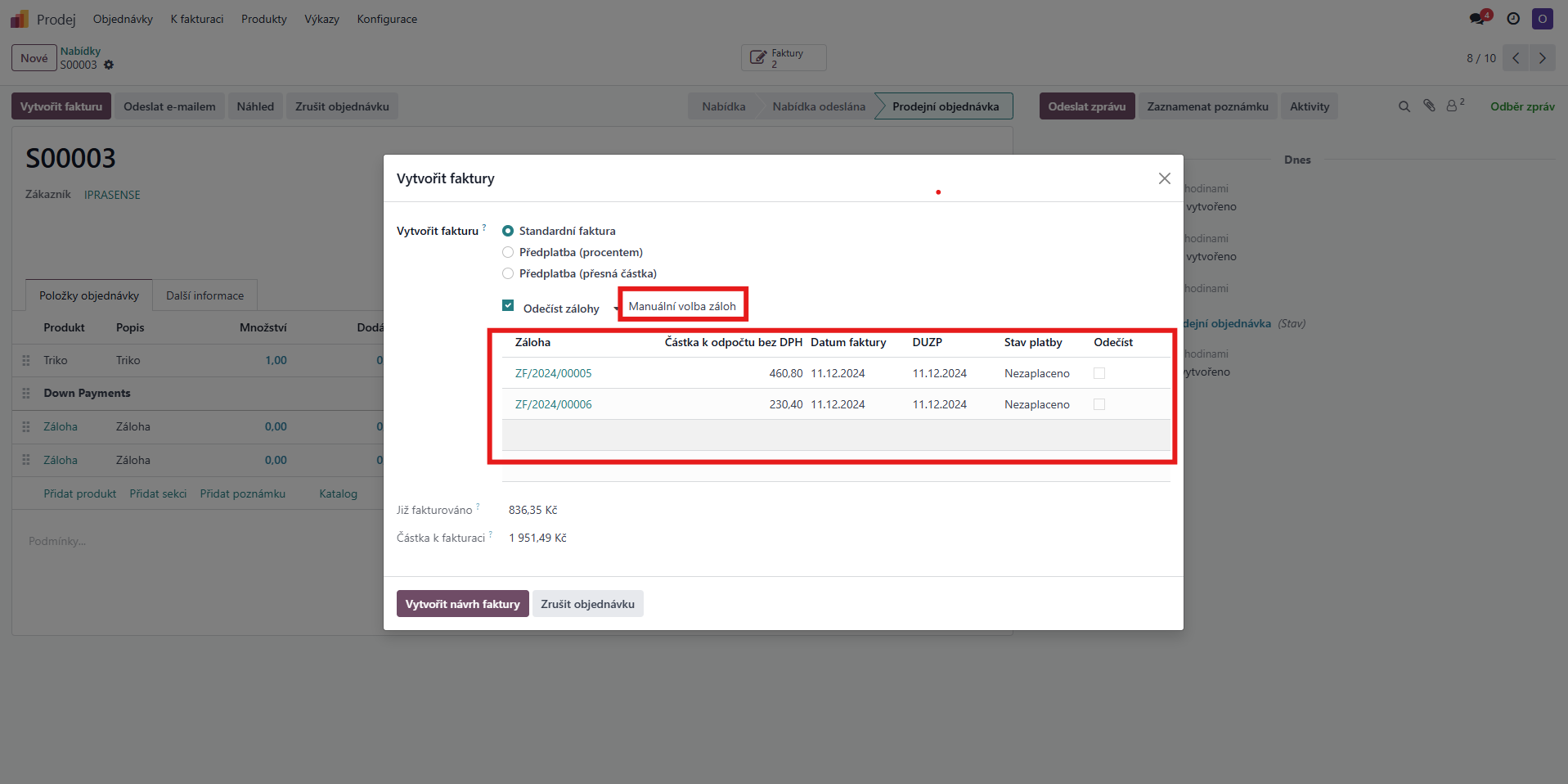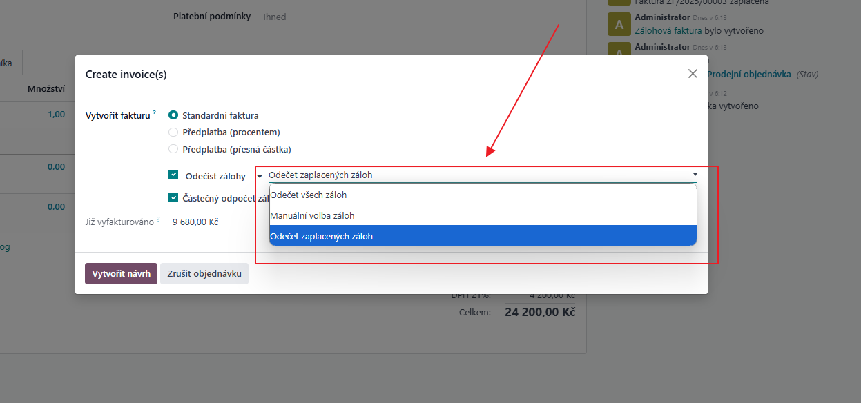 Pokud k objednávce vytvoříme Více než 1 zálohovou fakturu, Odoo nám při vytvoření standardní faktury nabídne odečíst zálohy