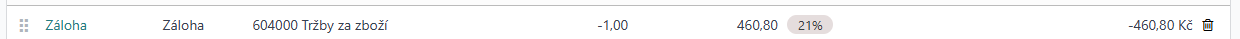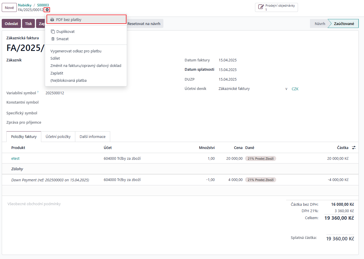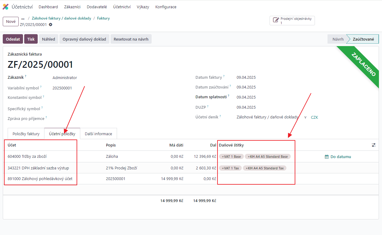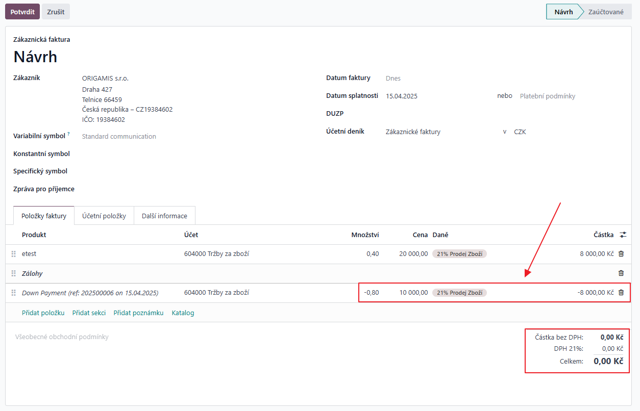 Po validaci si můžeme na faktuře všimnout, že byla odečtena taková část zálohové faktury, aby zúčtovací faktura byla nulová.