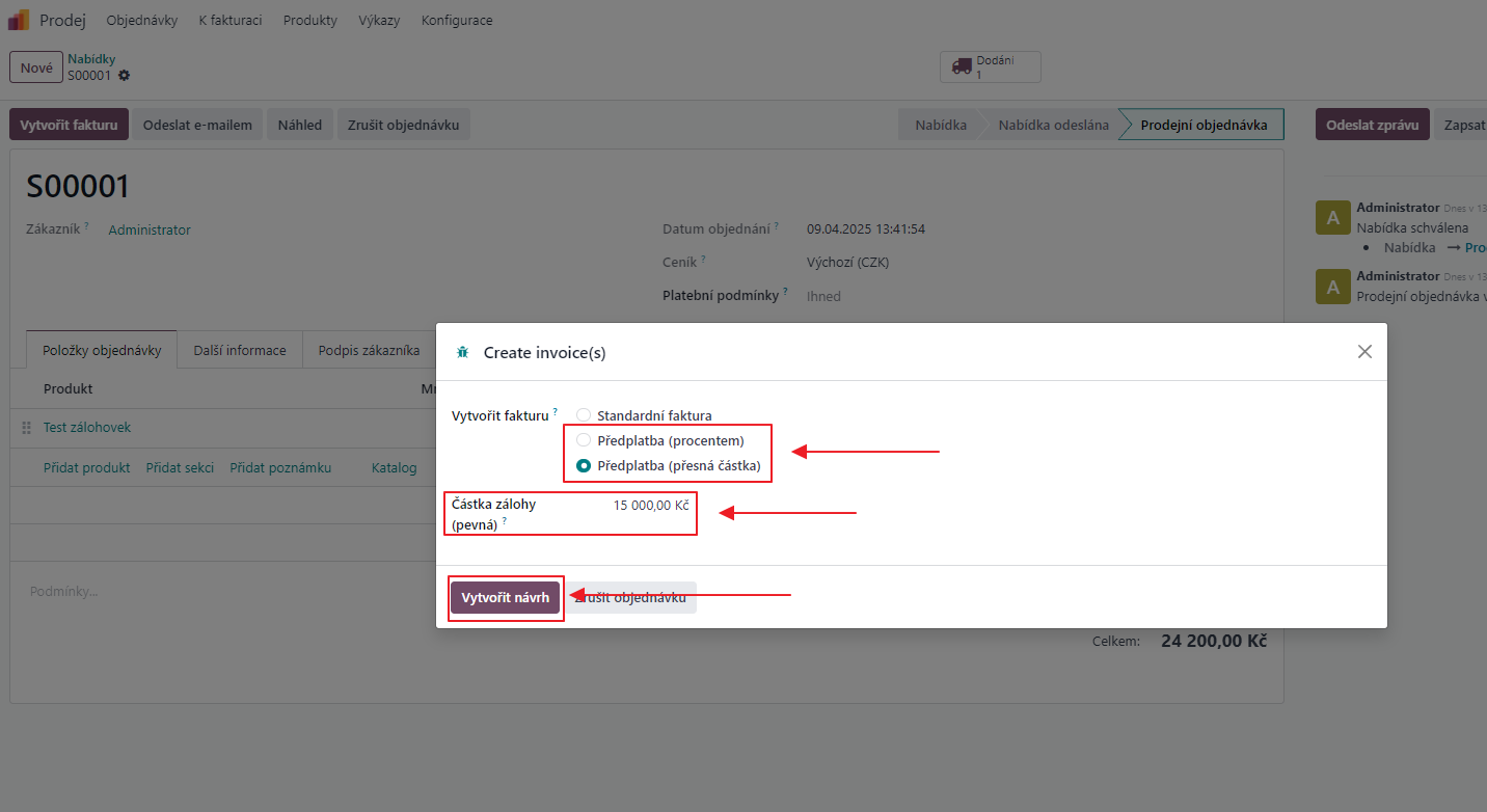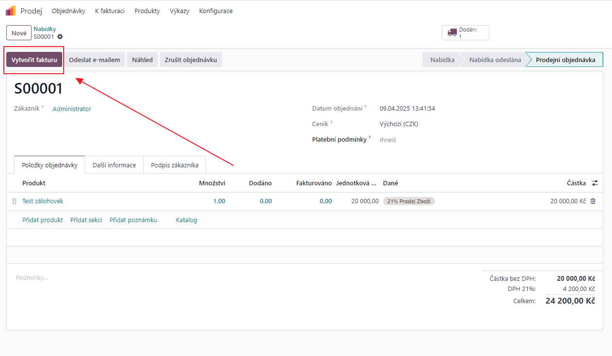 Zálohovou fakturu vytváříme z existující prodejní objednávky.