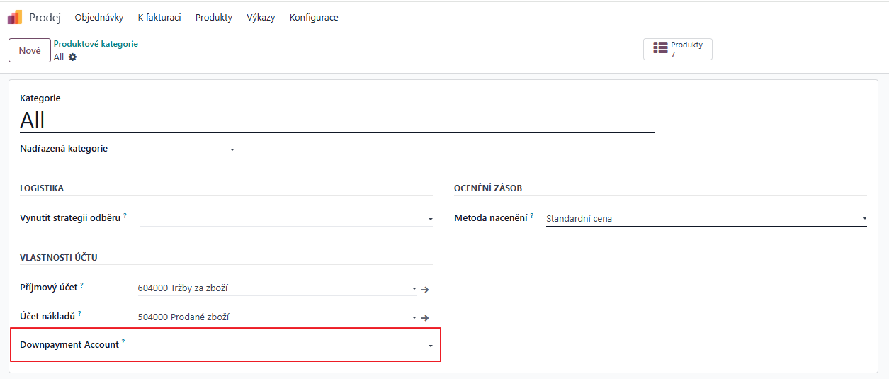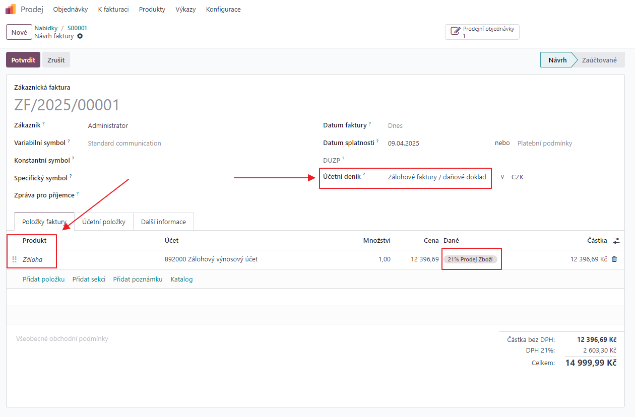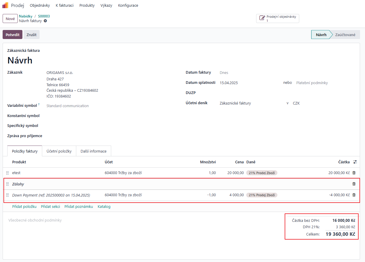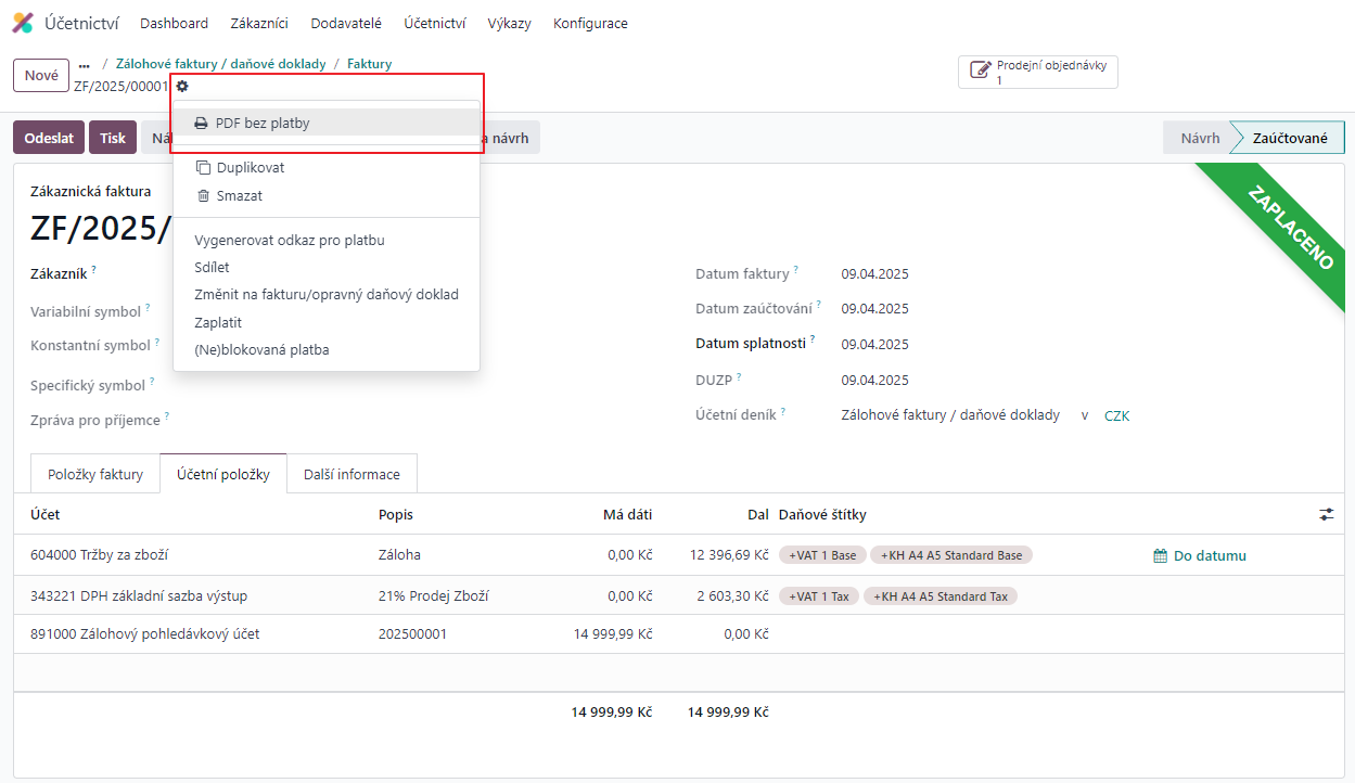 - Odoo nerozděluje a neodečítá části faktur na základě zvolené sazby DPH, namísto toho automaticky odečítá kompletní zálohovou fakturu
