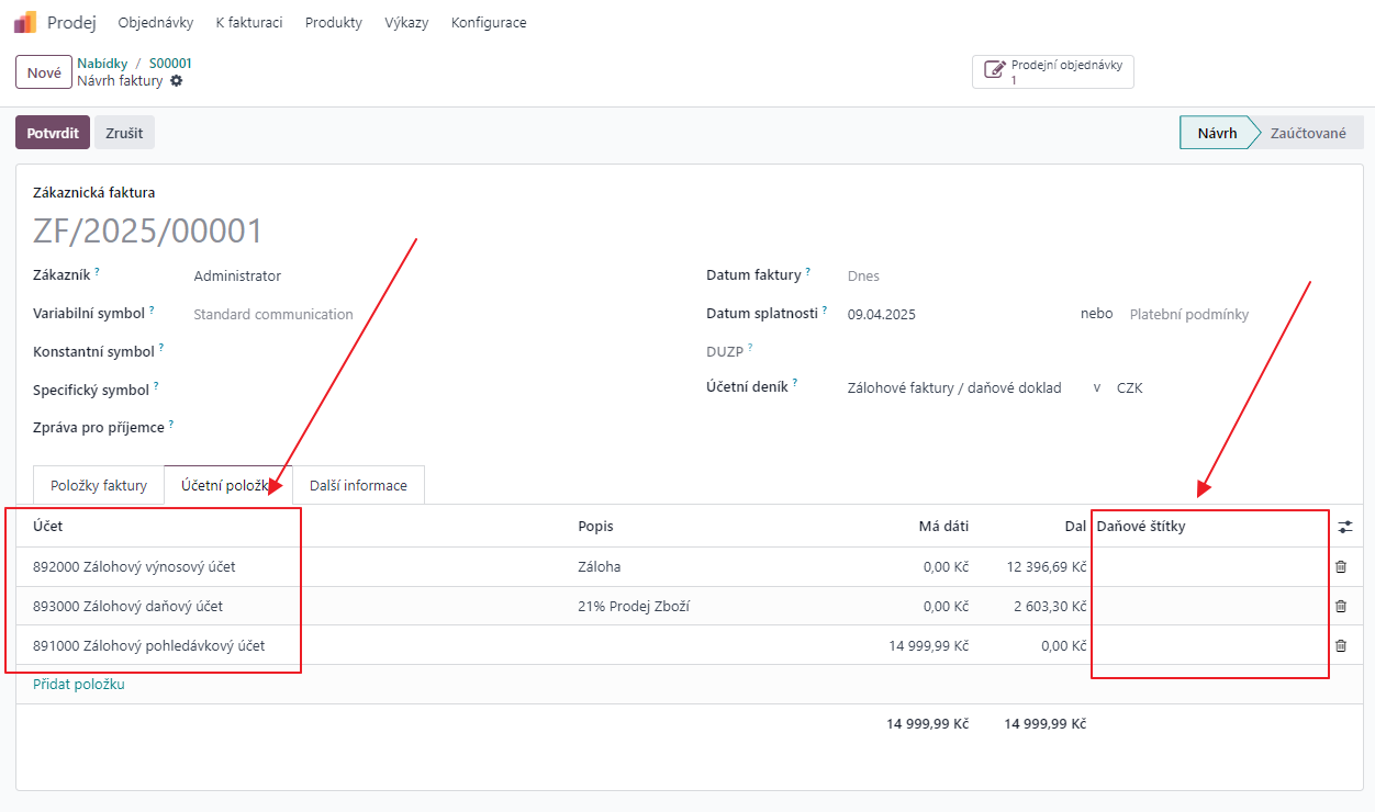 Zároveň v záložce "Účetní položky" vidíme využití podrozvahových účtů, díky kterým nám zálohy nevstupují do účetnictví. Pokud využíváte Odoo i pro daňové výkazy, můžete si všimnout, že zde nejsou přiřazeny daňové štítky, skrze které se report počítá.
