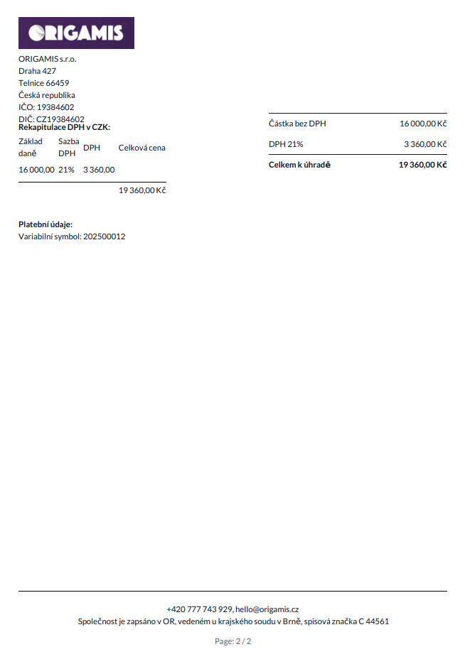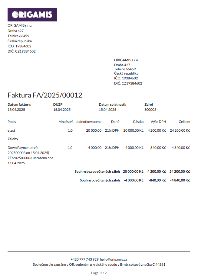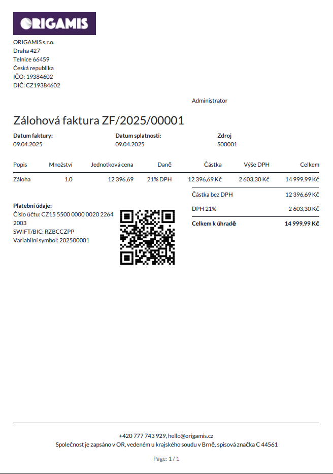 Samotná zálohová faktura je pak generována s přehledem platebních údajů, jejichž ucelený tisk přidává náš modul 📄 Base CZ .