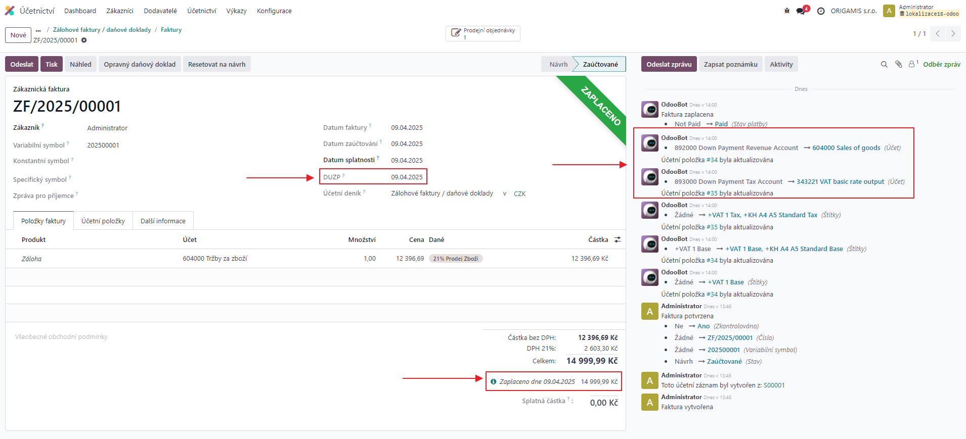 Již při spárování platby se nám v systému ukáže datum, ke kterému byla platba přijata. Stejně tak se zapíše DUZP na den přijetí platby. V chatteru lze také vidět, že faktura se automaticky přesune na rozvahové účty.