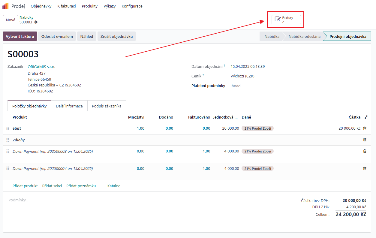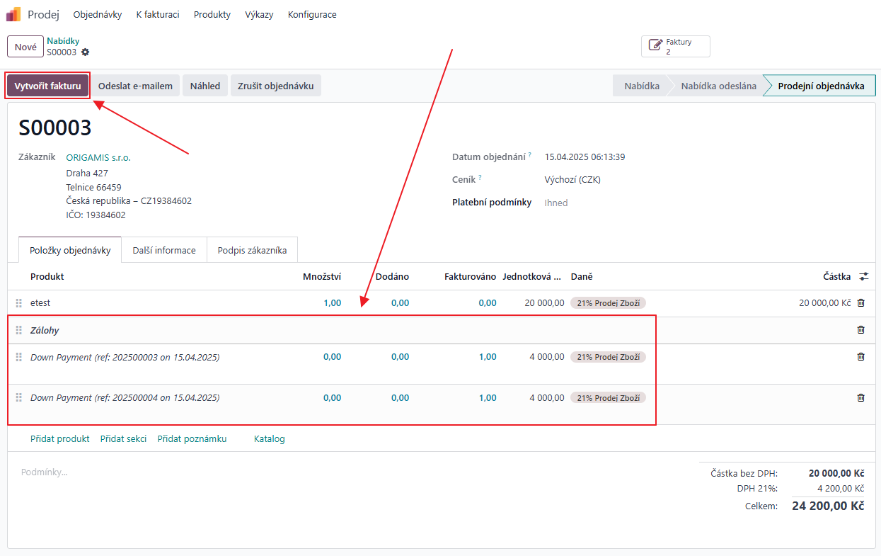 Pro vytvoření finální faktury se nyní potřebujeme vrátit do aplikace "Prodej" a otevřít si příslušnou prodejní objednávku. Zde si můžeme všimnout, že na objednávce přibyla nová sekce, která reflektuje zálohové faktury a hodnotu jednotlivých záloh. Pro vytvoření finální faktury pak opět využijeme tlačítka "Vytvořit fakturu".