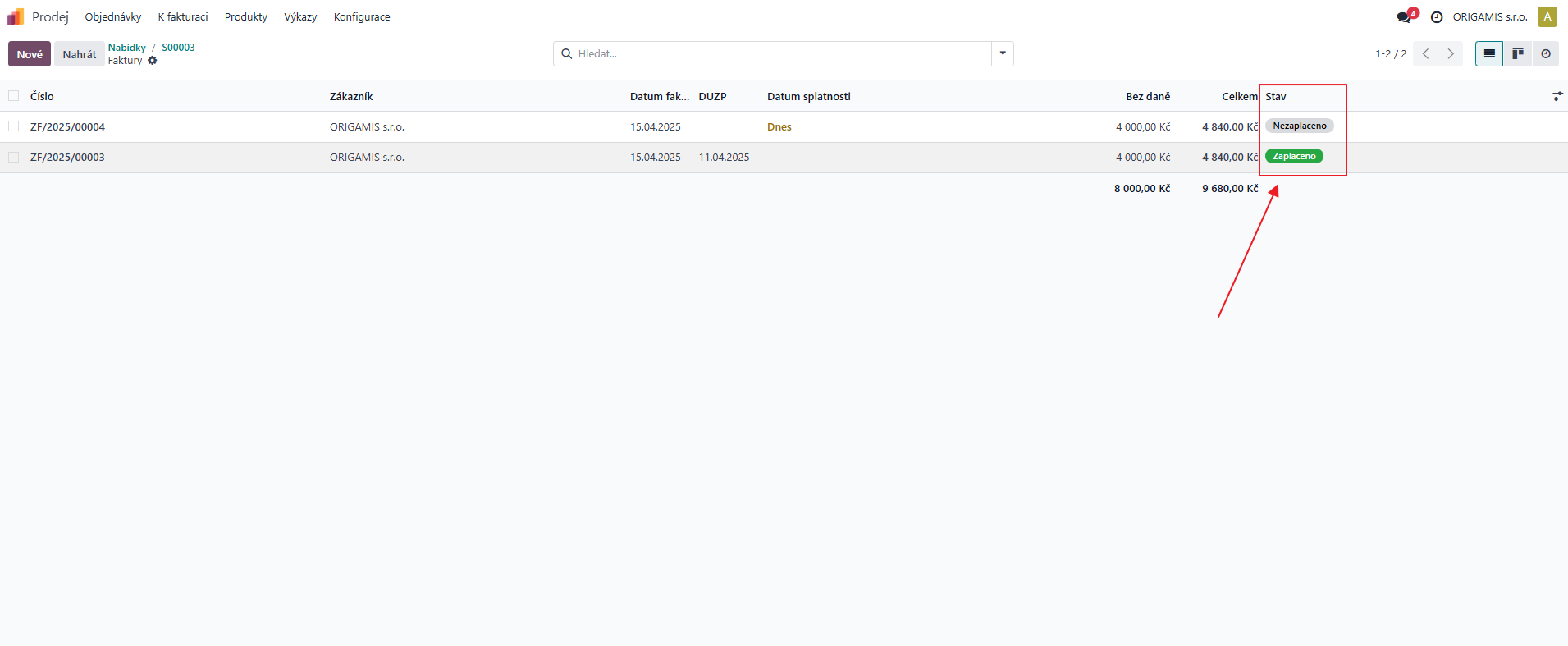 Vytvoříme si nabídku se zálohami, které budou v stavu: Nezaplaceno