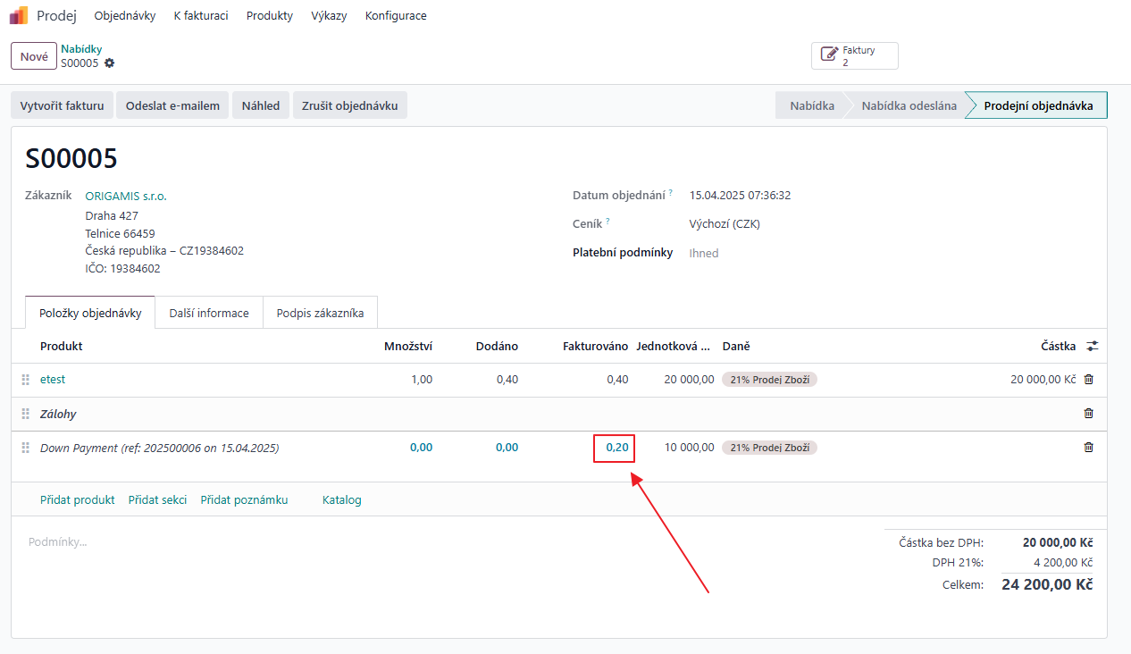 Na prodejní objednávce pak vidíme, jaká podílová část zálohové faktury zbývá k odečtu.