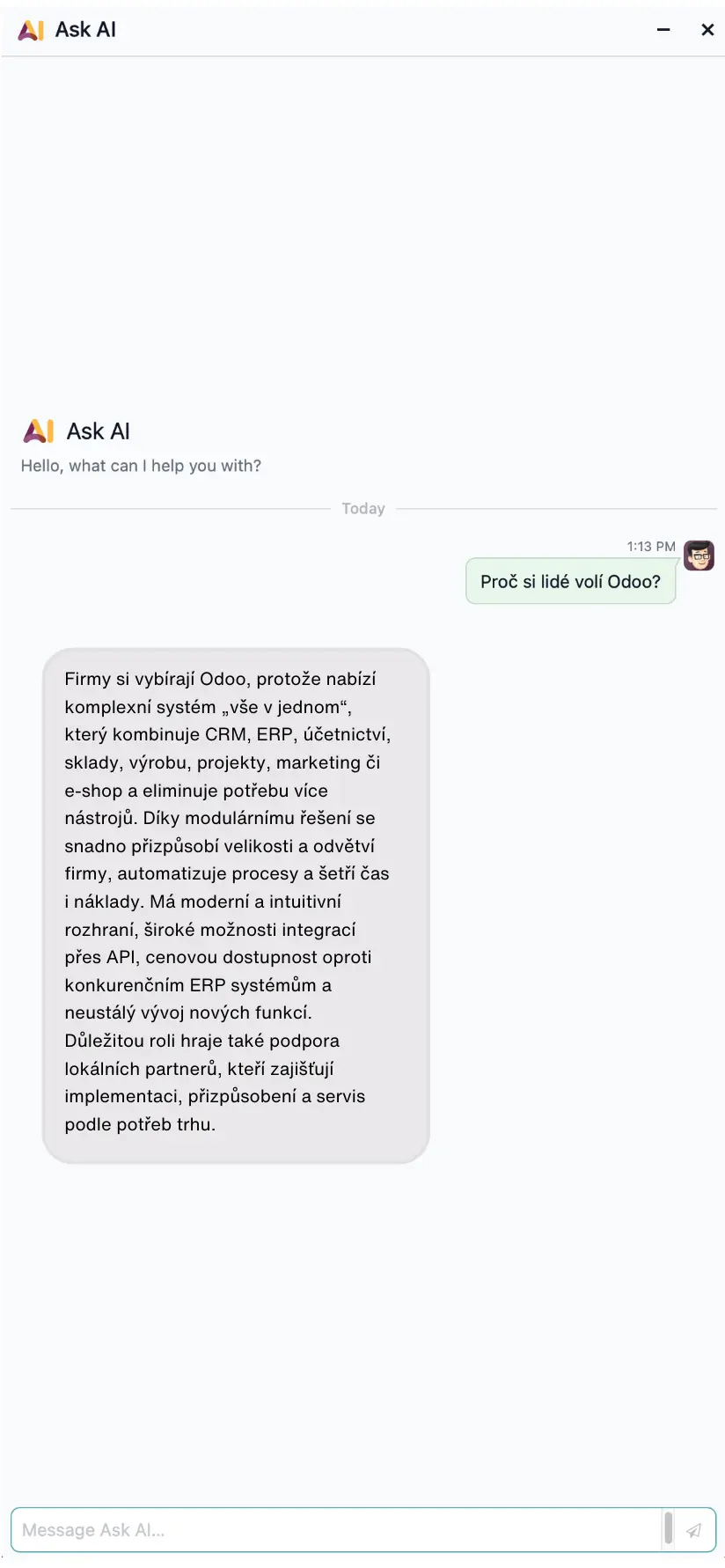 Odoo je podnikový systém navržený s důrazem na efektivitu a je vhodný pro firmy všech velikostí - od startupu až po velké podniky. Uživatel si může vybrat jen to, co aktuálně potřebuje (například jen fakturaci a CRM) a postupně přidávat další moduly dle potřeby.