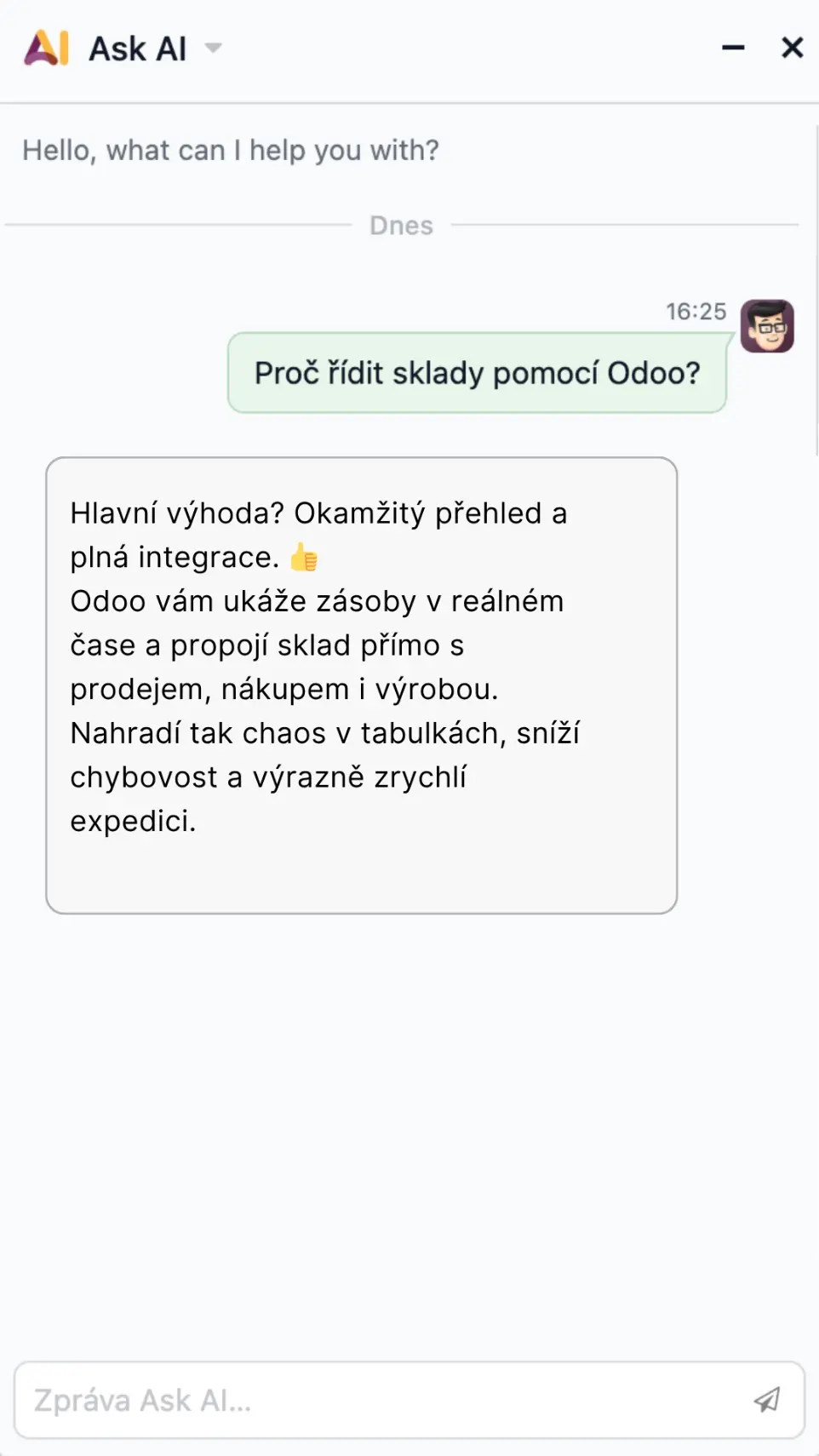 Odoo Sklady (Inventory) tyhle starosti řeší jediným systémem, který drží všechna data pohromadě. Každý příjem, výdej i přesun se okamžitě propíše do celé firmy a vy máte jistotu, že pracujete s reálnými informacemi. Skladníci mají jasné kroky, manažeři aktuální přehled a celý provoz běží rychleji a bez zmatků.